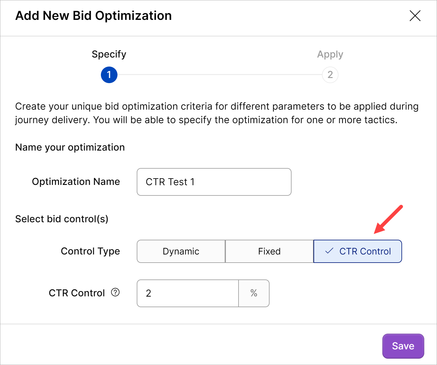 Marketers find CTR Control in the Bid Optimization panel at the top of the Journey Canvas. The field appears after selecting the Bid Optimization icon and choosing the applicable journey location. This workflow supports both journey wide and tactic level application.