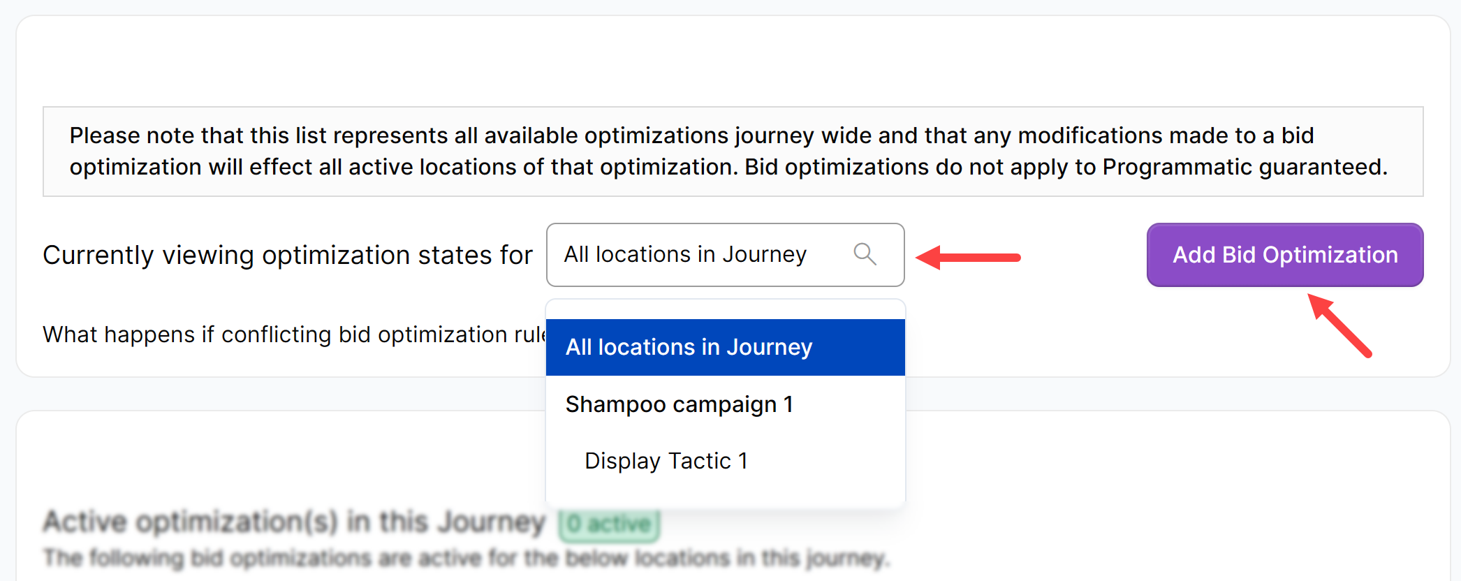 After you click the icon, a new window displays. Click the All locations in Journey field. Select a location on the drop-down menu to apply the optimization (e.g. stages, paths, etc.).