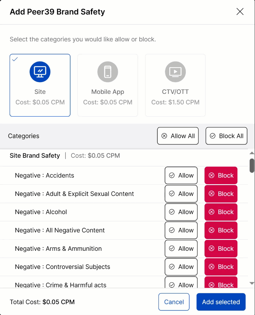 Use category filters to include (or exclude) content types that align with campaign goals. You can go broad or get super specific, skipping categories like adult content or violent news, while zeroing in on those that resonate with your audience.