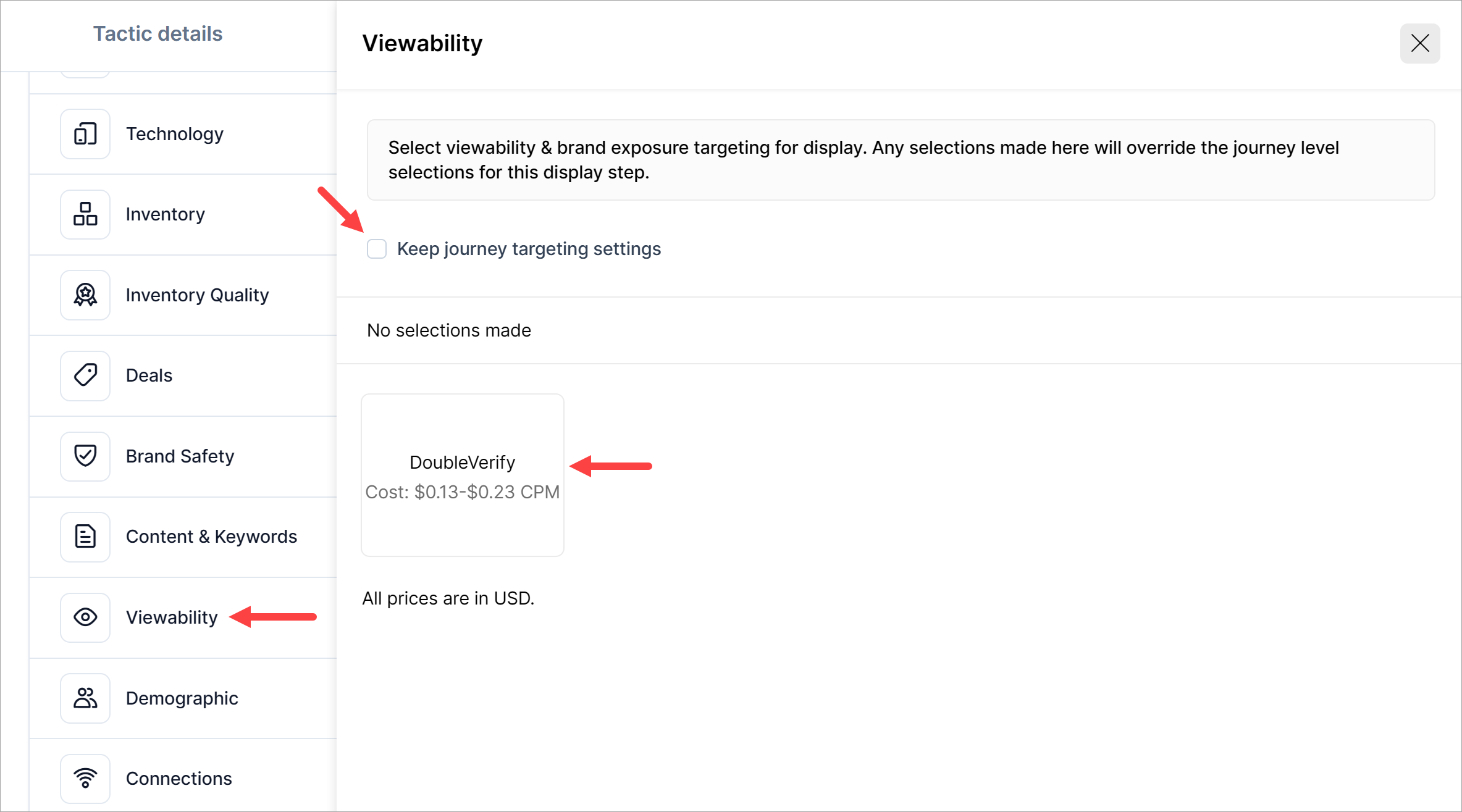 If you're working at the campaign level, select a tactic and click the Targeting tab. Scroll down the page, locate the Viewability row, and click the pencil icon. A side panel displays. Uncheck the box next to Keep journey targetings settings. Then click the DoubleVerify tile.