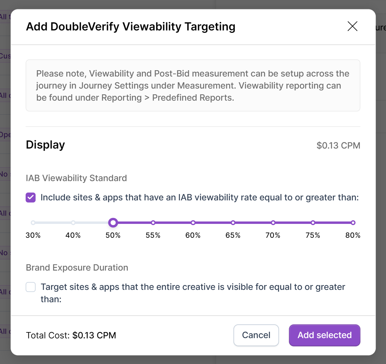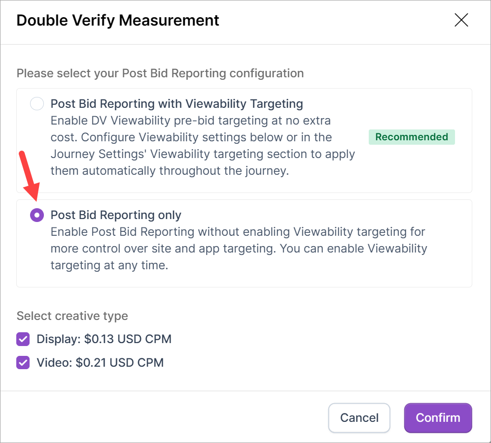 Enable DV Post Bid Reporting on new or existing Open Web campaigns on the enhanced Canvas, or Journey Canvas. Optionally, combine Post Bid Reporting with Viewability Targeting. This combination lets advertisers choose ad placements before bidding, based on predicted viewability scores. This helps optimize campaigns for high-viewability impressions but does not include post-bid measurement.
