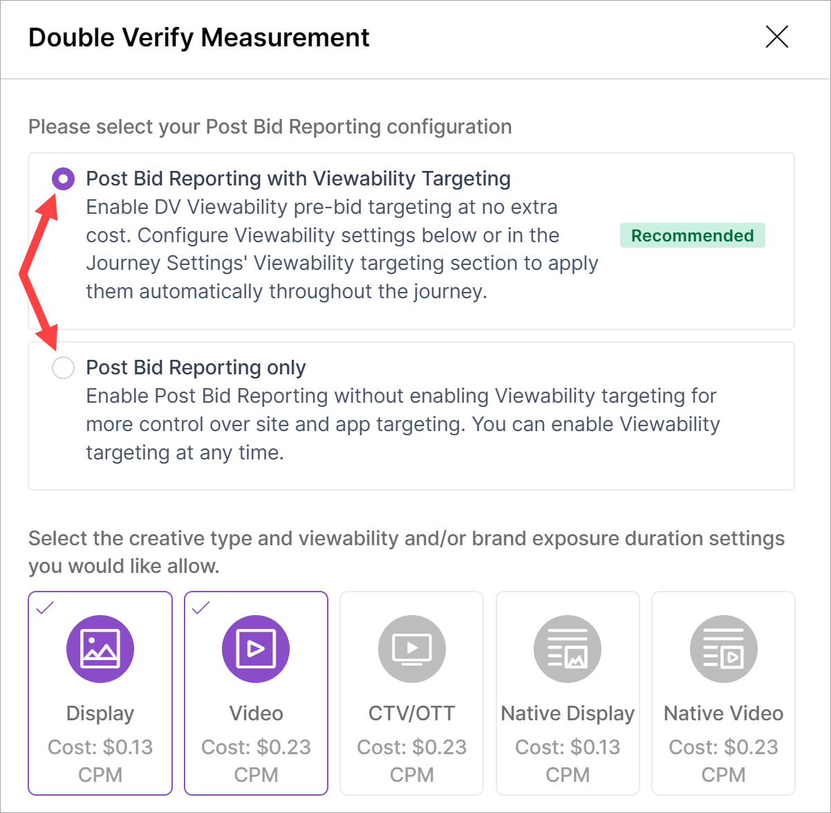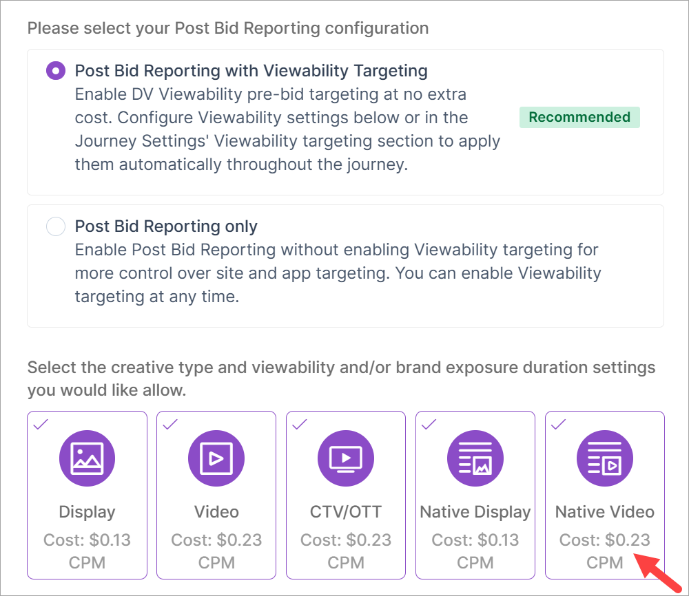 On the Settings page, you have two implementation options: Post Bid Reporting with Viewability Targeting and Post Bid Reporting only. Both options have the same CPM.