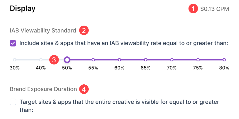 Now you can enable Viewability Targeting for the tactic without Post Bid Reporting. Note this option comes with a reporting limitation. If you enable DV Viewability Targeting without enabling Post Bid Measurement (see below), illumin's predefined DV Integrated Metrics report does not display any post-bid metrics.