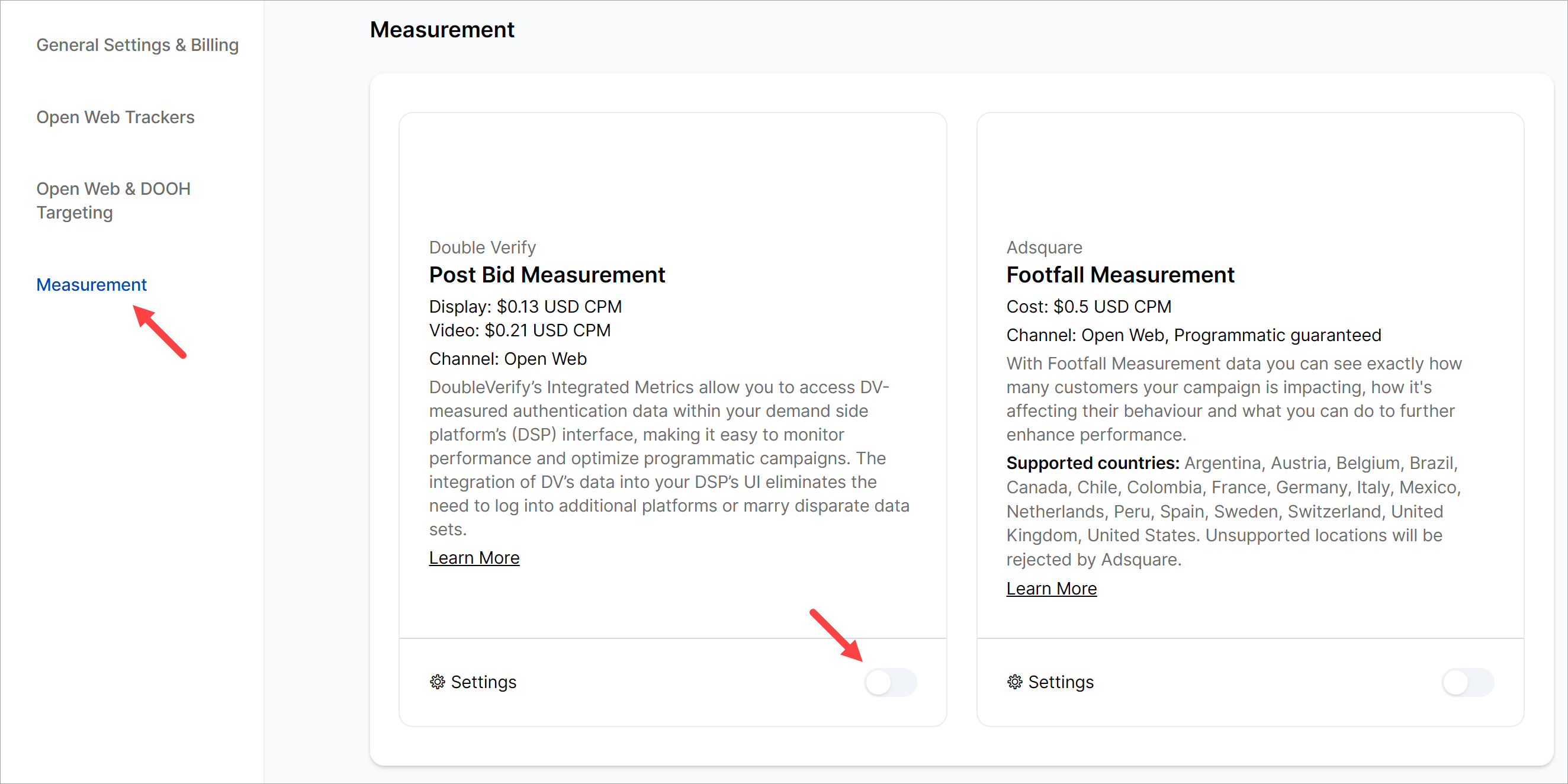 Go to the Settings panel and click the Measurement menu link. Switch on the Post Bid Measurement toggle to open the settings window.