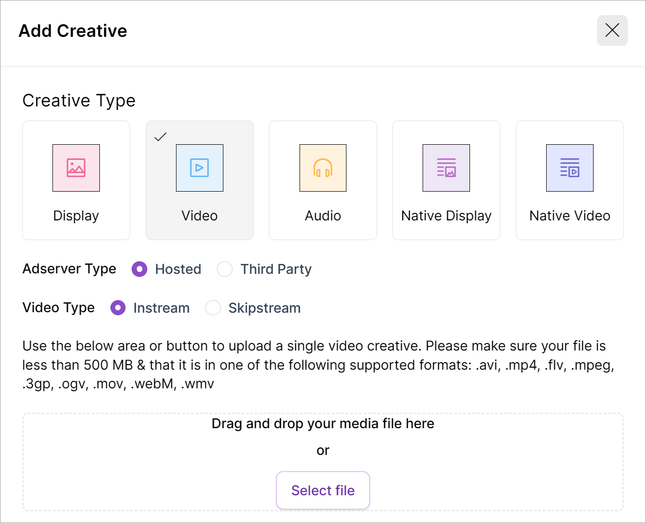 Select the video option. The side panel screen prompts you to select an adserver type.