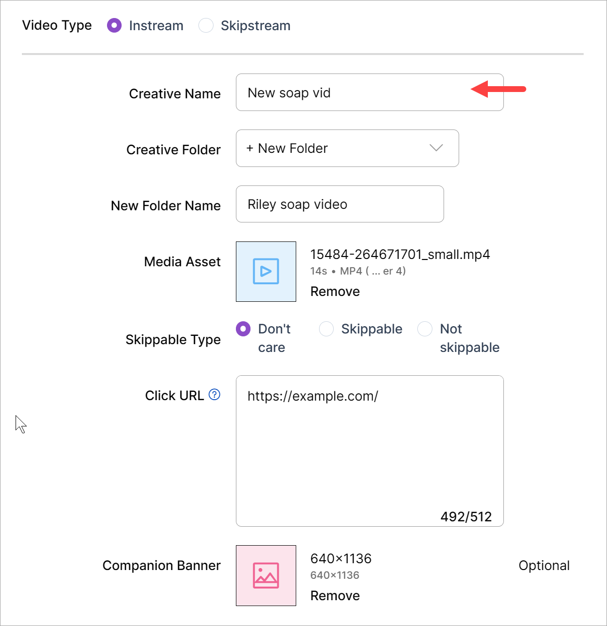 Click the Select file button. Select a file on your device. A new form displays. The only required field is the Click URL field, which holds the website URL and, optionally, a UTM parameter. Creating a new folder is optional but recommended. Click Add to save the file. illumin adds the folder and file to the Creatives table.