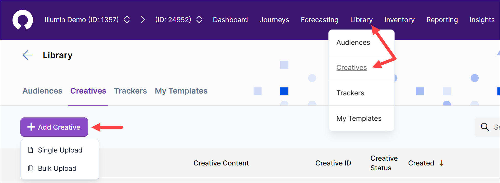 When complete, click the upload button in the bottom corner of the page. illumin uploads the files to the Creatives table.
