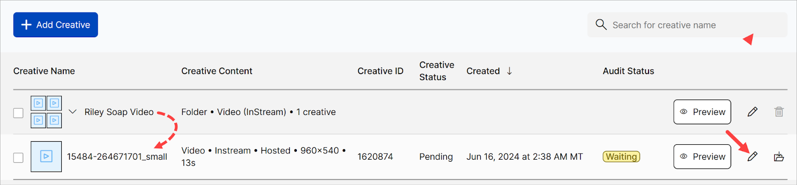 Go to the Creatives table and expand the folder. There is one row for each file. To review or edit file settings, go to the row and click the pencil icon.