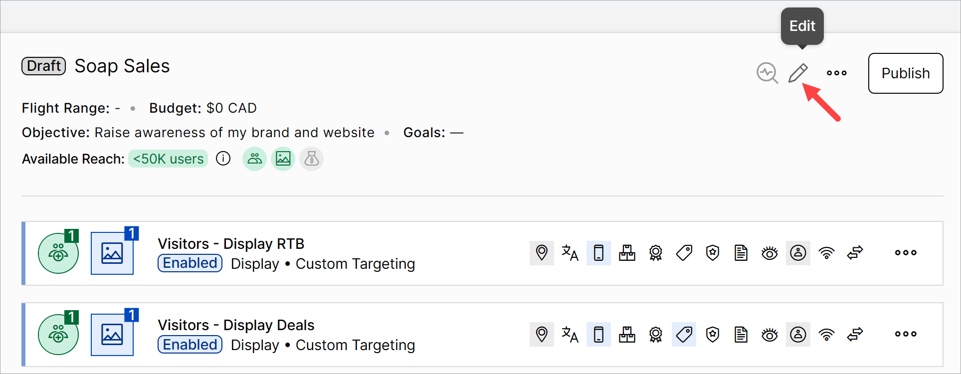 3. Campaign: The rectangular box is called a campaign. It holds all the important elements like audience, creatives, targeting settings, budgets, flight ranges, and more. Each campaign can hold one or more tactics. You can have multiple campaigns on the canvas.