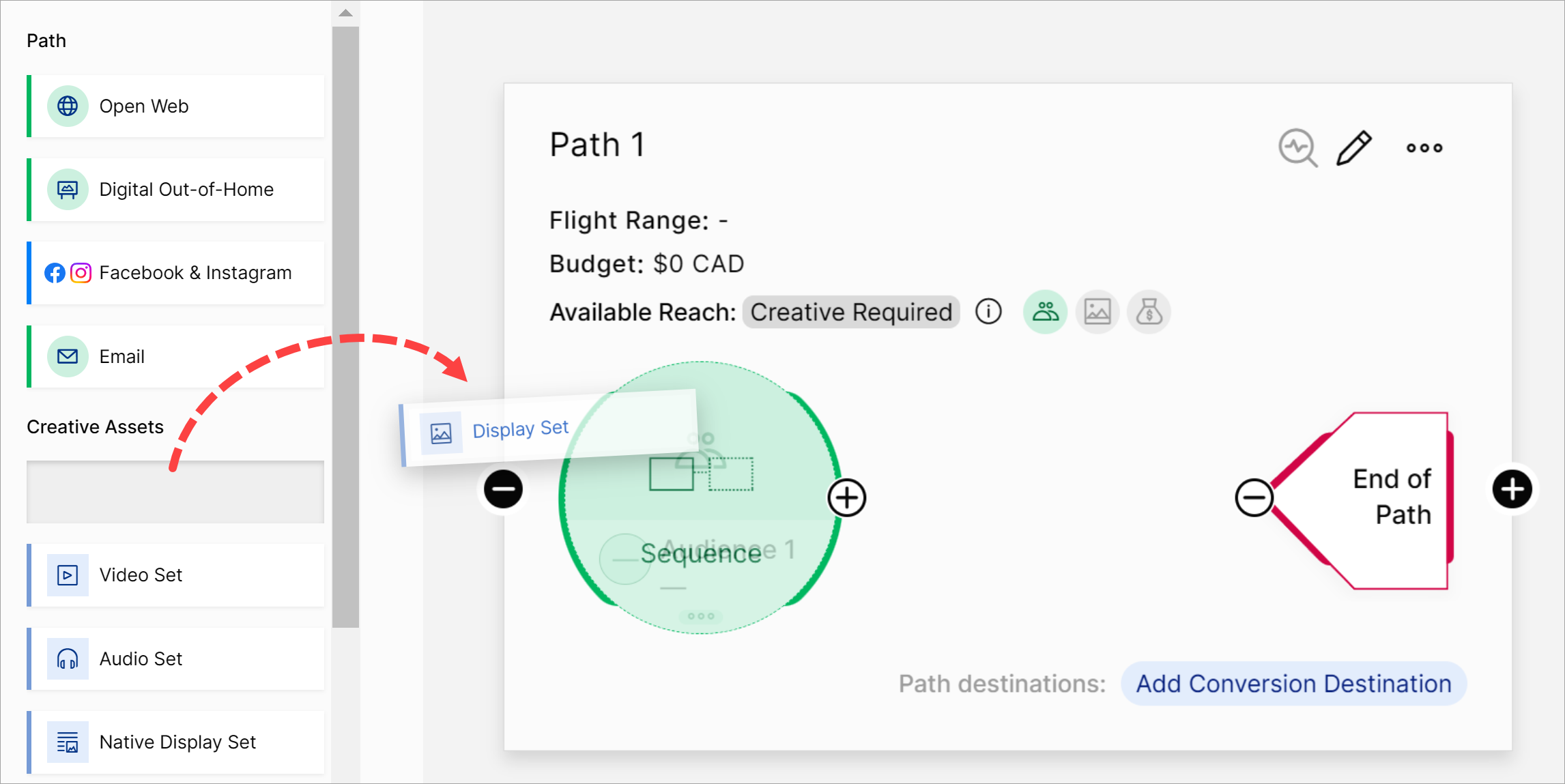 Go to the side menu and expand the Toolbox folder. Go to the Creative Assets section and drag a Display Set tile to the Audience icon. Then, drag the Video Set tile to the path.