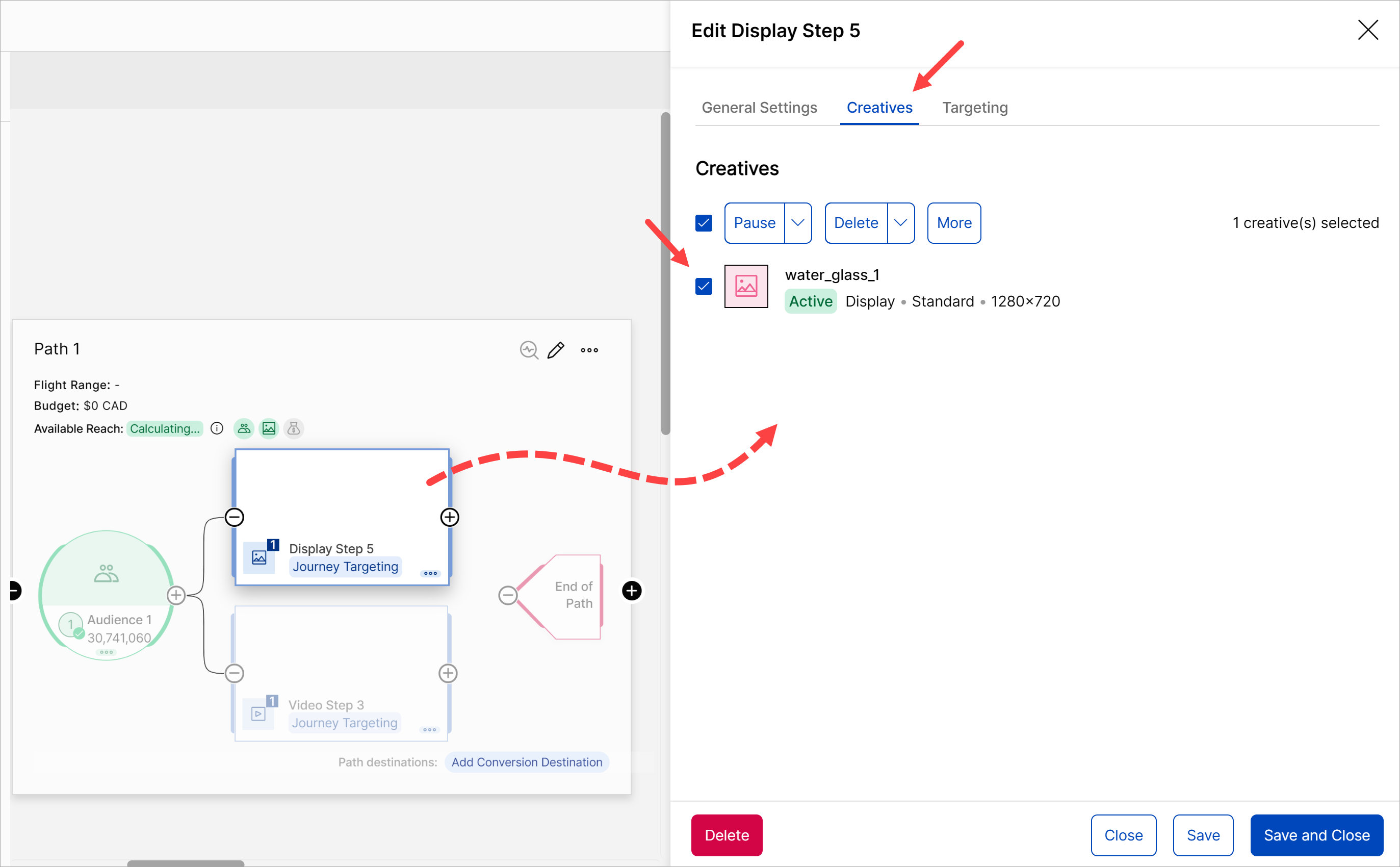 To review or update an audience or creative, click a placeholder one time. A side panel displays. If you're inspecting a creative, click the Creatives tab. You have several options. For instance, you can check a box and delete the creative but keep the placeholder.