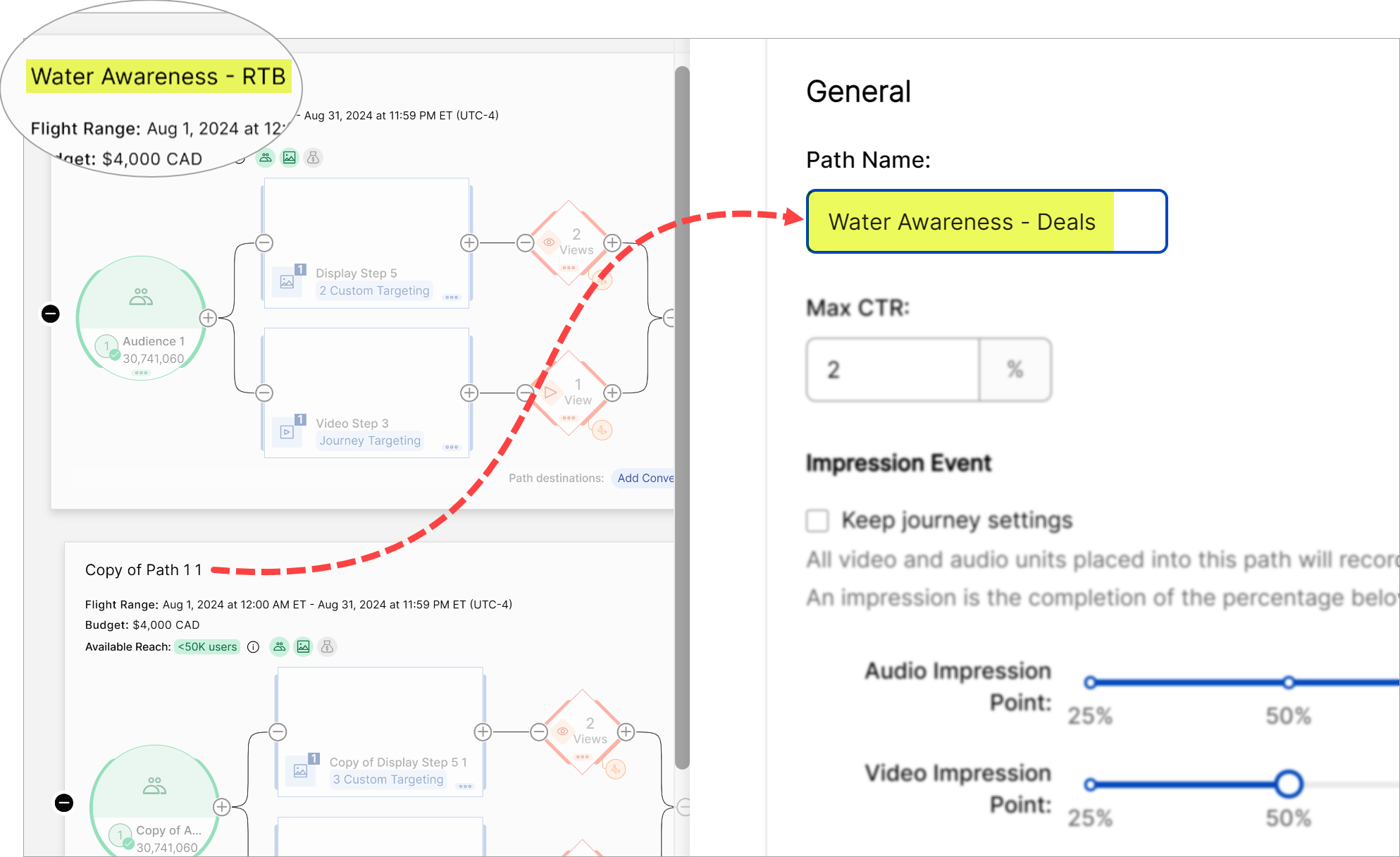 Select a path and click the three-dot icon in the top right corner. Click Clone. The canvas creates a copy of the path and its settings. To avoid confusion, let's rename each path.